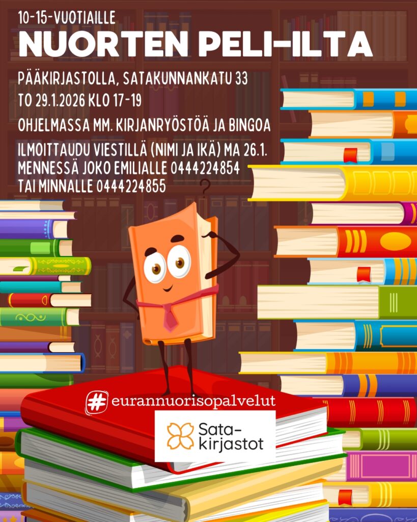Euran pääkirjastolla 10-15-vuotiaille nuorille peli-ilta to 29.1.2026 klo 17-19. Ohjelmassa mm. kirjanryöstöä ja bingoa, tarjolla mehua ja naposteltavaa. Ilmoittaudu viestillä (oma nimi ja ikä) joko Emilialle 0444224854 tai Minnalle 0444224855 ma 26.1. mennessä. Mukaan mahtuu 8-16 nuorta.