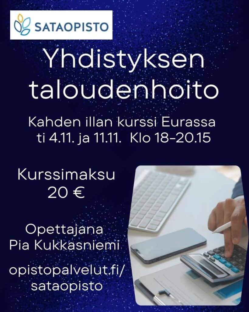 Sataopisto järjestää kahden illan koulutuksen, joka on tarkoitettu erityisesti yhdistysten taloudesta vastaaville henkilöille. Opettajana toimii itse myös yhdistystoiminnassa aktiivisesti mukana oleva Pia Kukkasniemi. Klikkaa otsikkoa ja saat lisätietoa.