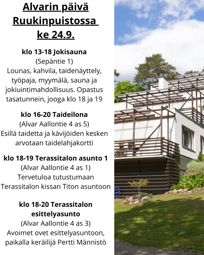 Keskiviikkona 24.9. Kauttuan Ruukinpuistossa vietetään Alvar Aalto -hengessä Alvarin nimipäivää. Alla luetelluissa kohteissa on avoimia ovia ja muuta mahdollista toimintaa. Tervetuloa vierailulle!