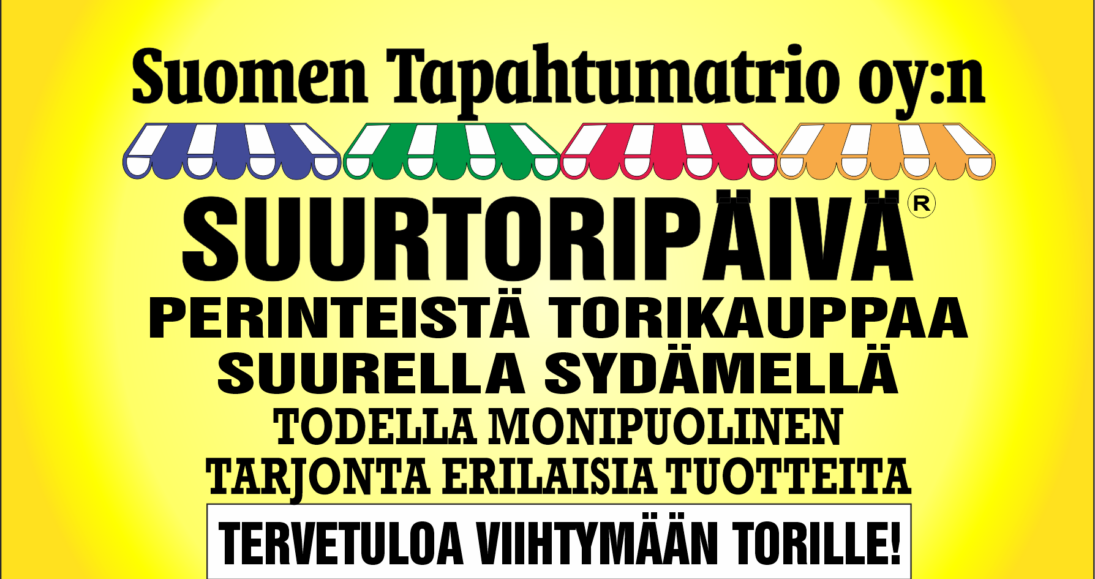 Suurtoripäivä on jo useilta vuosilta tuttu, mukava toritapahtuma, jossa asiakkaita palvelee noin 25 torikauppiasta. Suurtoripäivä on nimensä mukaisesti isompi, kuin monilla paikkakunnilla toripäivät normaalisti, mutta pienemmät kuin markkinat. Siksipä ollaankin koottu tämä meidän oma kauppiasporukka erilaisten tuotteiden myyjistä, että saadaan tarjottua teille mahdollisimman monipuolinen kattaus.