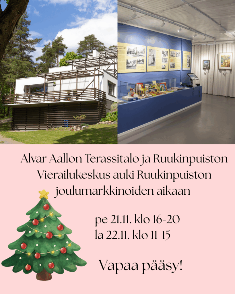 Alvar Aallon Terassitalolla ja Ruukinpuiston Vierailukeskuksessa on Ruukinpuiston joulumyyjäisten aikana avoimet ovet ja vapaa pääsy. Tervetuloa tutustumaan arkkitehtuuriin sekä Ruukinpuiston historiaan!